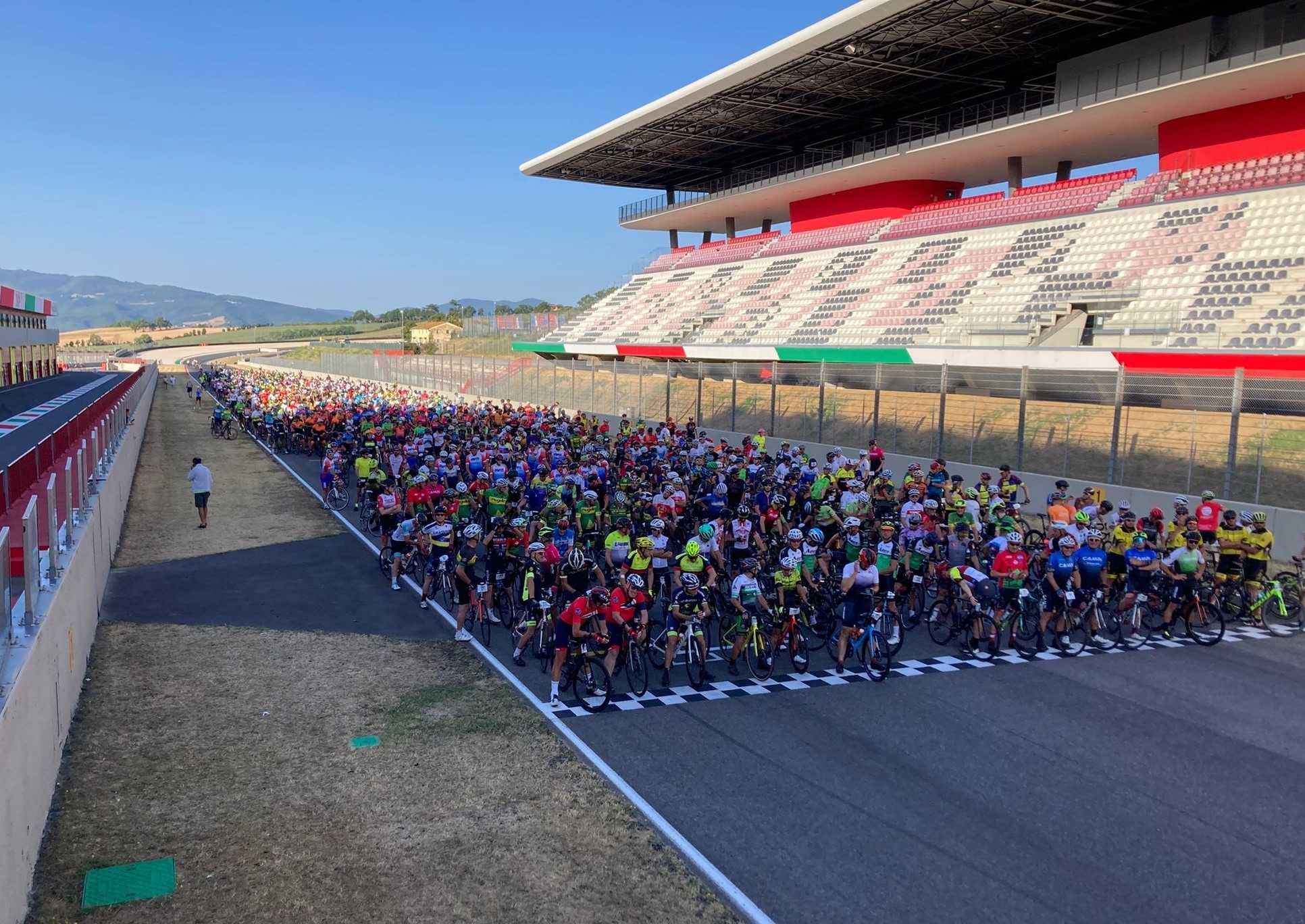 Dopo il giro dentro l’autodromo i ciclisti sono sfilati dipanandosi sui quattro percorsi (tre stradali e uno gravel) e chi ha voluto (sul percorso medio e su quello lungo) si è impegnato anche nelle cronoscalate con classifica.